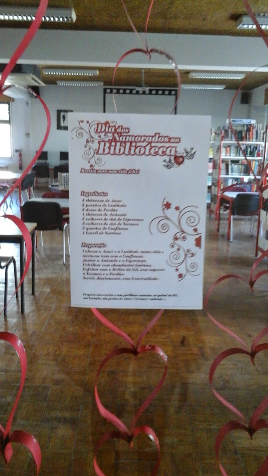A vitrine da biblioteca anunciava um concurso de cartas/poesias e até mostrámos a receita do amor....